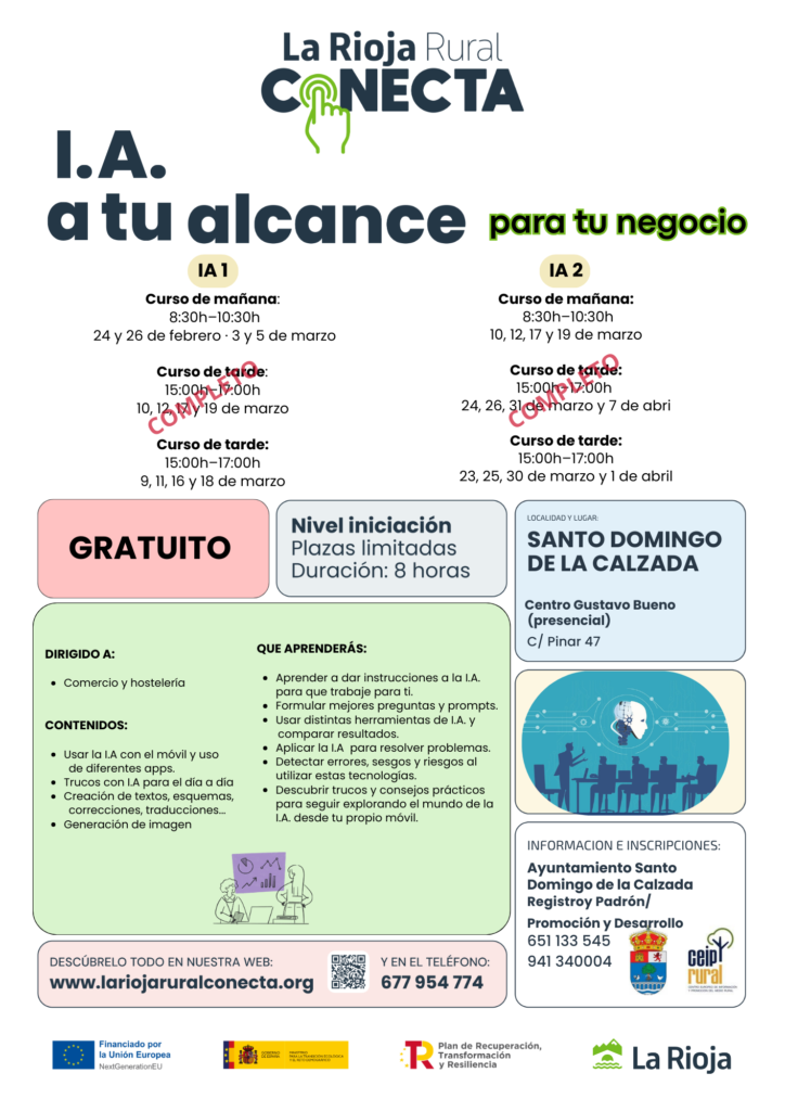 Al haberse completado los cursos de IA para comercio y negocios por la tarde, se ha solicitado uno nuevo de IA nivel 1 y otro de IA nivel 2, ambos en horario de tarde.