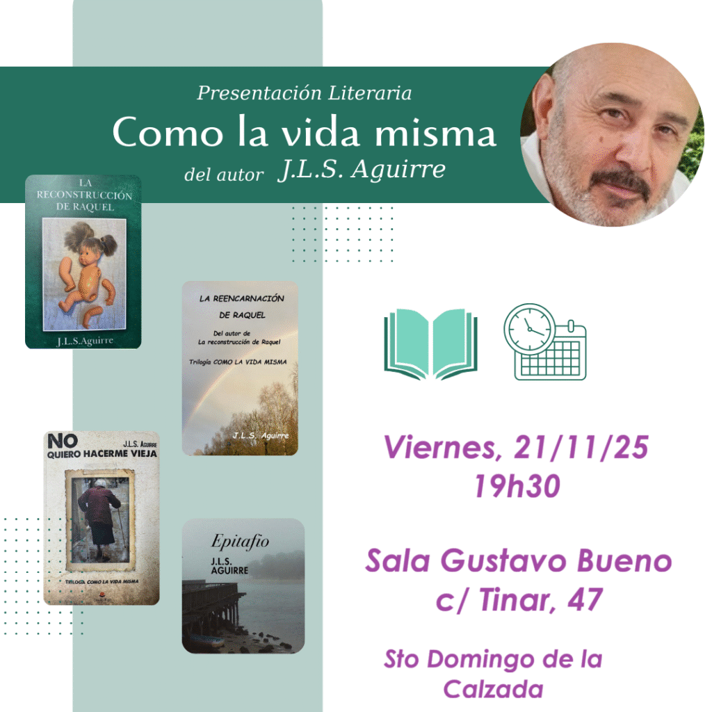 El Ayuntamiento de Santo Domingo de la Calzada invita a la ciudadanía a la presentación de la trilogía Como la vida mismaLa reconstrucción de Raquel, La reencarnación de Raquel y No quiero hacerme vieja— junto con la novela Epitafio, del autor José Luis Salvatierra Aguirre.